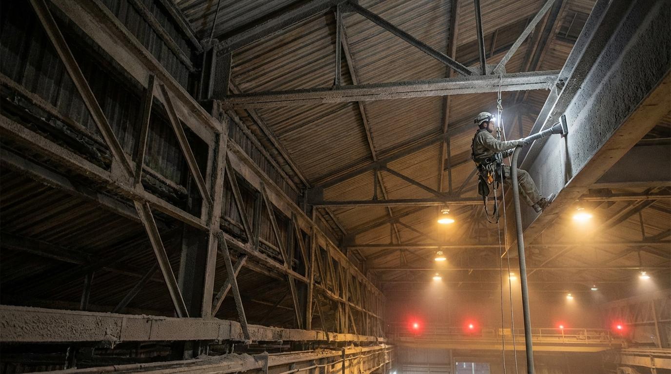 Inspektor Państwowej Straży Pożarnej zaplanował kontrolę hali za sześć tygodni. Kierownik zakładu przegląda dokumentację i przy punkcie dotyczącym stanu czystości construccji podsufitowych pojawia się cisza. Ostatni wpis w rejestrze prac — sprzed ponad trzech lat. Na belkach stalowych widać z podłogi przyprószoną warstwę ciemnego pyłu. W głowie pojawia się pytanie: czy to już problem, czy jeszcze nie?