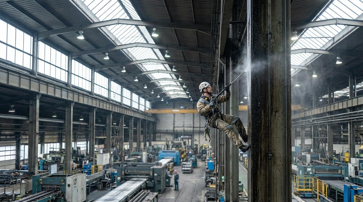 Kierownik utrzymania ruchu przechodzi przez halę przed audytem GMP. Podłogi są czyste — firma sprzątająca zajmuje się nimi regularnie. Ale wzrok wędruje w górę: belki dźwigarów są pokryte warstwą ciemnego nalotu, wentylatory wyciągowe świecą tłustym brudem, na kablodragach pod sufitem widać czarną substancję trudną do zidentyfikowania. Standardowa ekipa sprzątająca twierdzi, że to nie jej zakres. I ma rację — nie ma sprzętu, żeby tam dotrzeć.